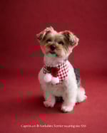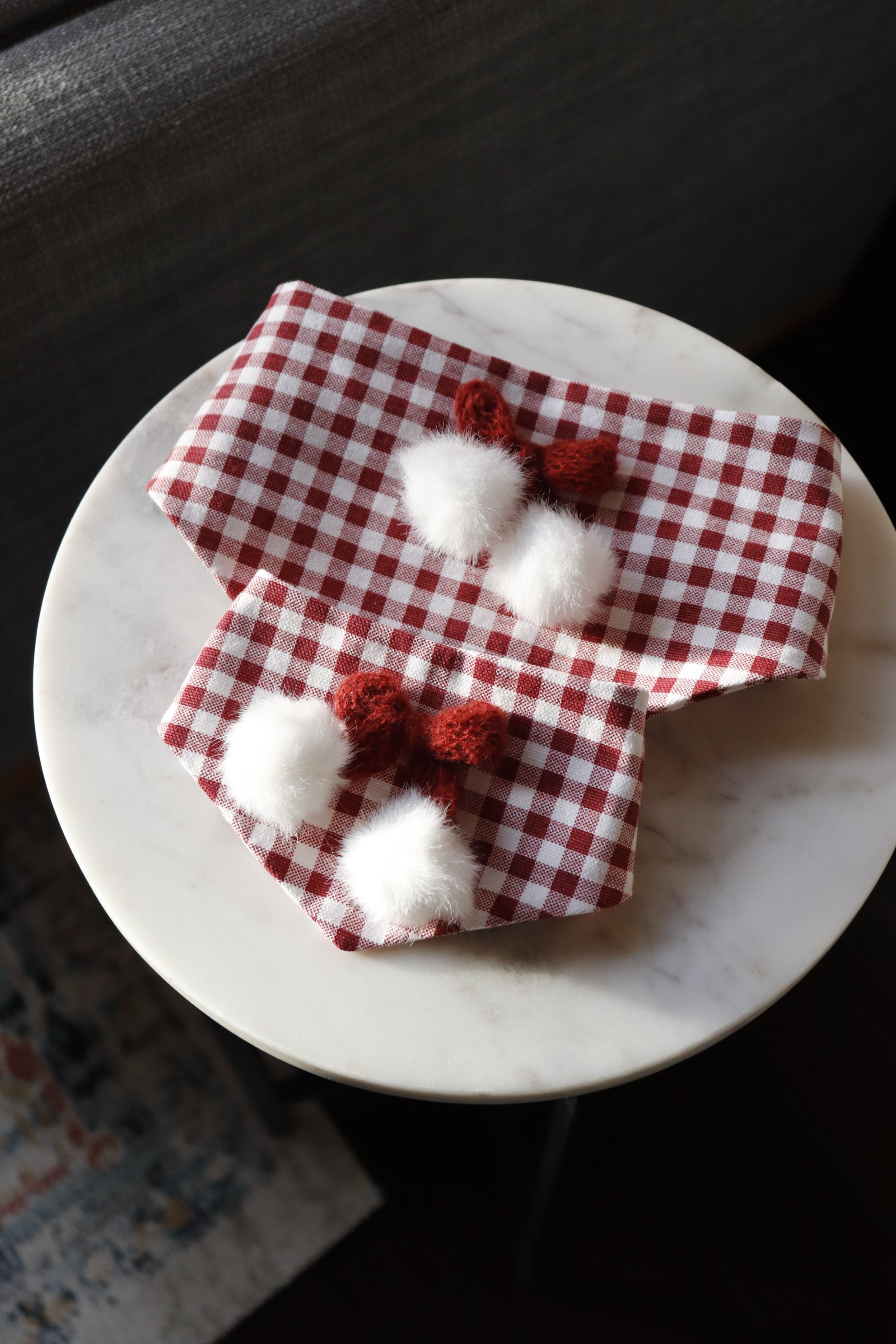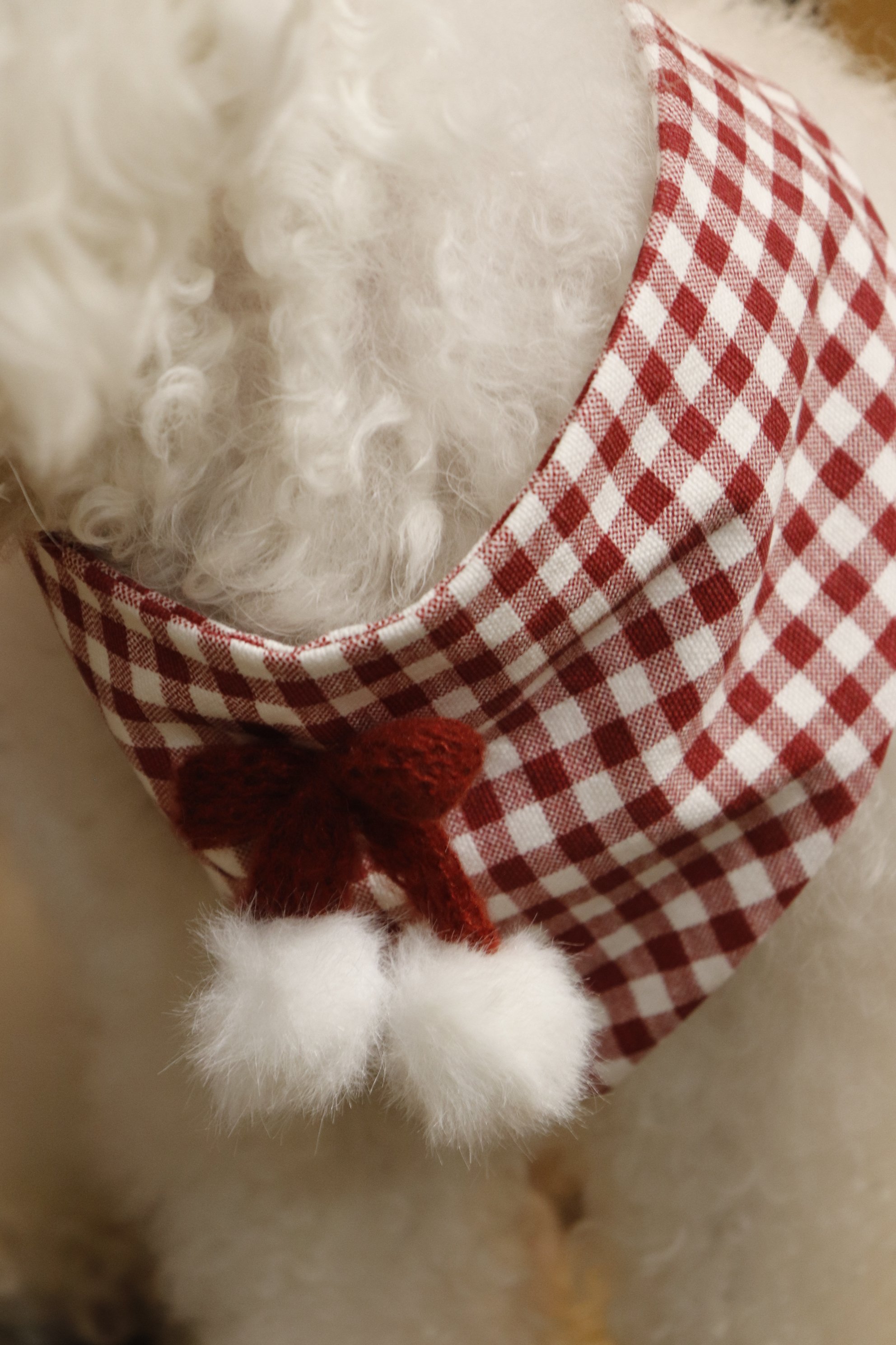 This red-and-white gingham bandana features a stitched-on red bow with fluffy pom details that stays in placeβno slipping or fuss.